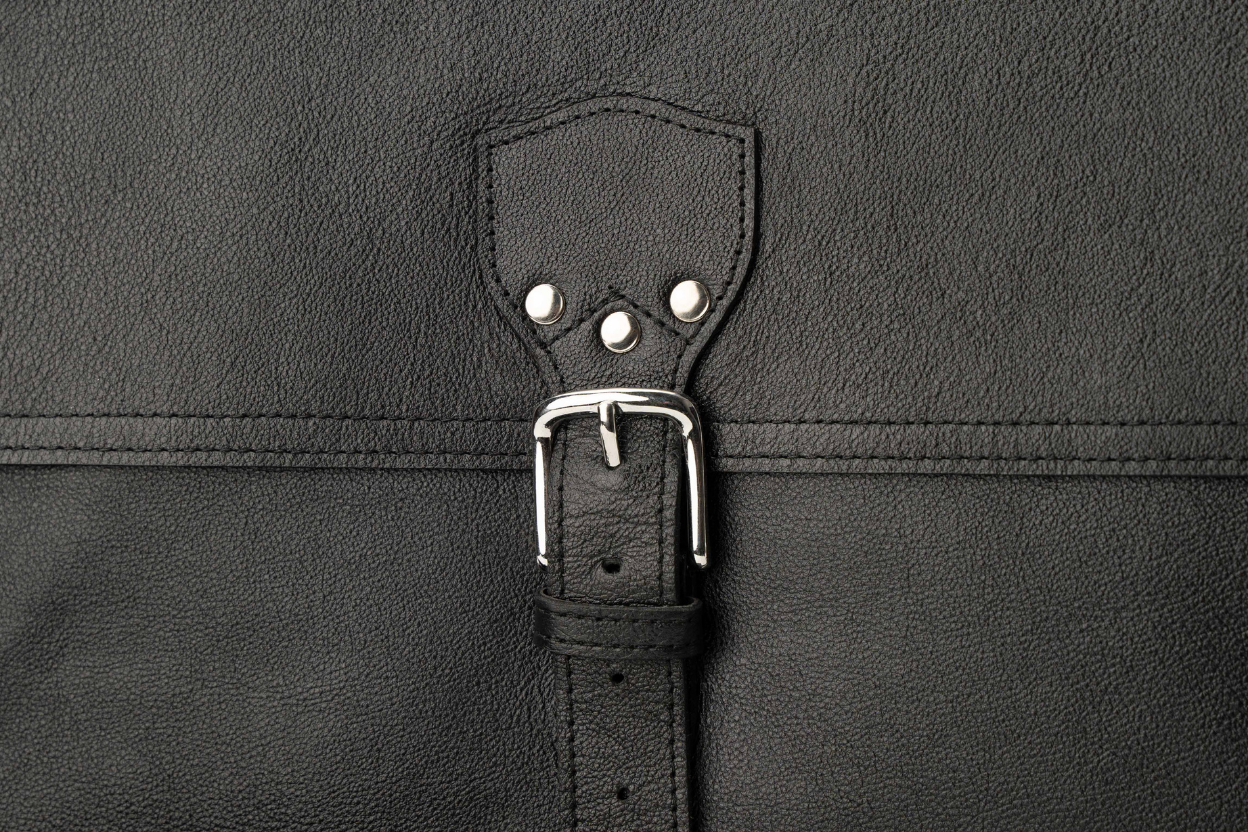 Secure & Polished Hardware: Features a classic buckle closure over the main flap, secured with durable metal hardware that contrasts beautifully with the black leather.