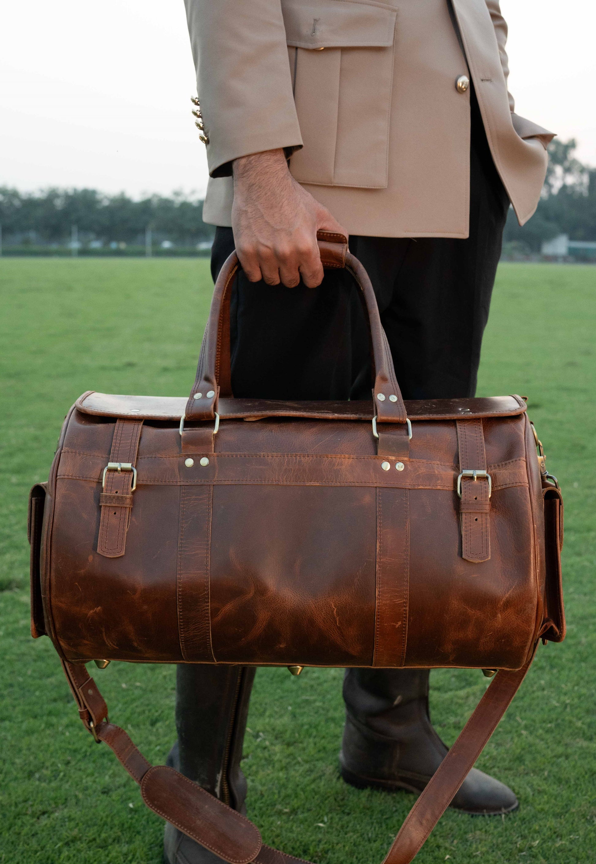 Detailed Craftsmanship: Accentuated with leather buckle straps wrapping around the body for structural support and a rugged, vintage travel aesthetic.